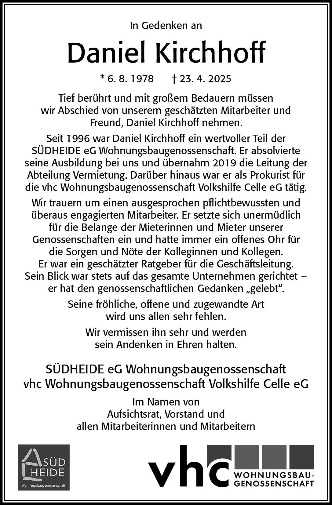 Kooperation macht vieles leichter: Auf Basis eines Geschäftsbesorgungsvertrags werden Vermietung, Verwaltung und operative Dienstleistungen der vhc Wohnungsbaugenossenschaft Volkshilfe eG durch die ebenfalls in Celle ansässige Wohnungsbaugenossenschaft SÜDHEIDE eG übernommen. Sie stellt deshalb auch die Ansprechpartner, die persönlich für Ihre Fragen und Wünsche da sind. Wir freuen uns, von Ihnen zu hören!